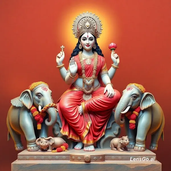 AI Image: Lakshmi goddess image in seated position with left leg down with two elephants holding garlands and