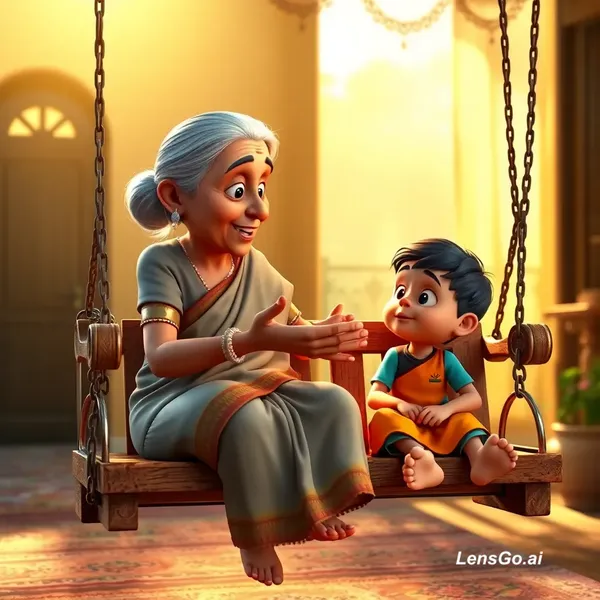 AI Image: "An emotional 3D animation of an Indian grandmother sitting on a wooden swing (jhoola) with her litt