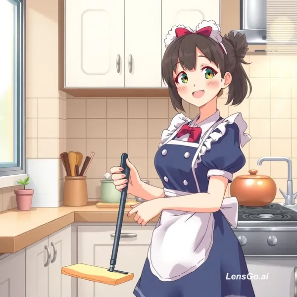 AI Image: anime happy maid cleaning a kitchen