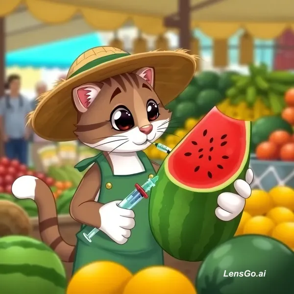 A cartoon cat wearing a straw hat and green apron is injecting a syringe into a watermelon. The background shows a market scene with other fruits and vegetables, as well as blurred figures of people.