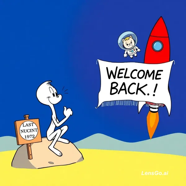 Looney Tunes 2D animation, vibrant flat colors, exaggerated Tex Avery style. A cartoon Moon character sitting alone on a rock, checking a giant wristwatch, tapping foot impatiently. Sign next to him: "Last Visit: 1972." Rocket finally arrives, Moon jumps up excited, dusts off a "Welcome Back" banner that's cobweb-covered and falling apart. Astronaut peeks out window awkwardly. Moon glares. 10 seconds.
