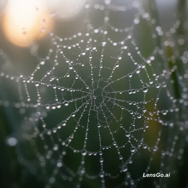 AI Image: Macro photograph of morning dew on spider web, bokeh background