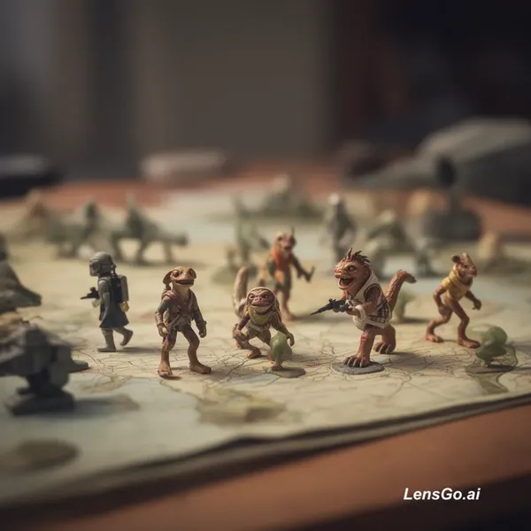 AI Image: Miniature Star Wars inspired creatures walking across a tabletop, tiny detailed figurines with soft