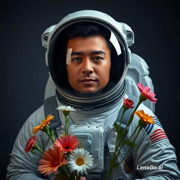 AI Image: Studio portrait of an astronaut holding flowers, dramatic lighting