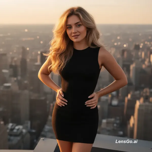 High-quality lifestyle photography of a stunning woman with long, wavy honey-blonde hair, wearing a sleek black ribbed bodycon mini-dress. She is posing confidently on a skyscraper rooftop with her hands on her hips. The background is a wide-angle, panoramic view of a sprawling urban skyline, softly blurred with a beautiful bokeh effect. The lighting is the rich, warm glow of golden hour, hitting her from the side to create highlights on her hair and skin. Shot on a 35mm lens, f/1.8, high resolution, realistic skin textures, cinematic urban atmosphere