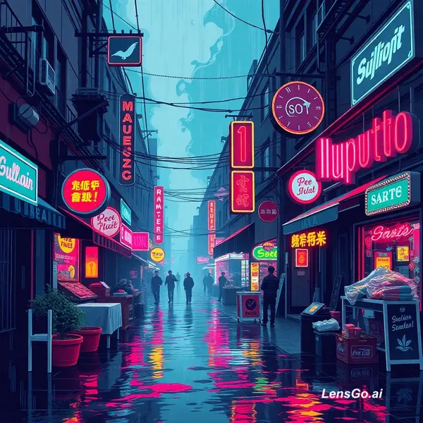 AI Image: Cyberpunk street market in the rain, neon signs and steam rising