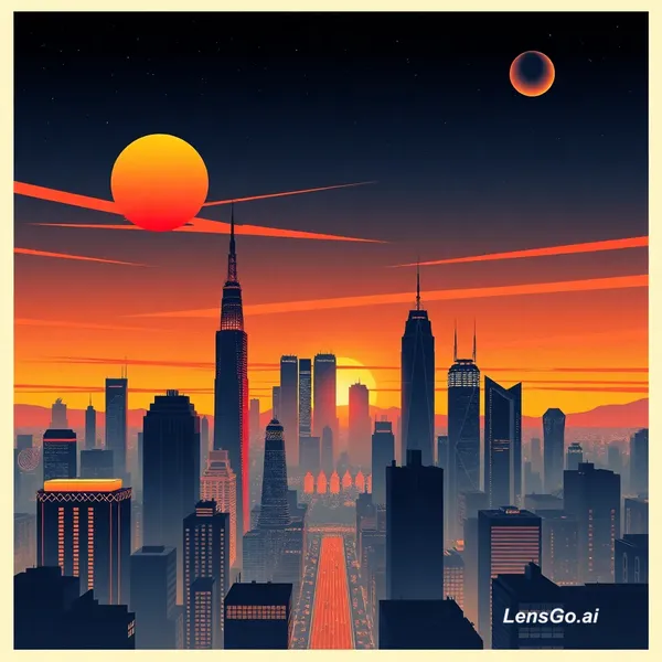 AI Image: Art deco poster of a futuristic city skyline at sunset