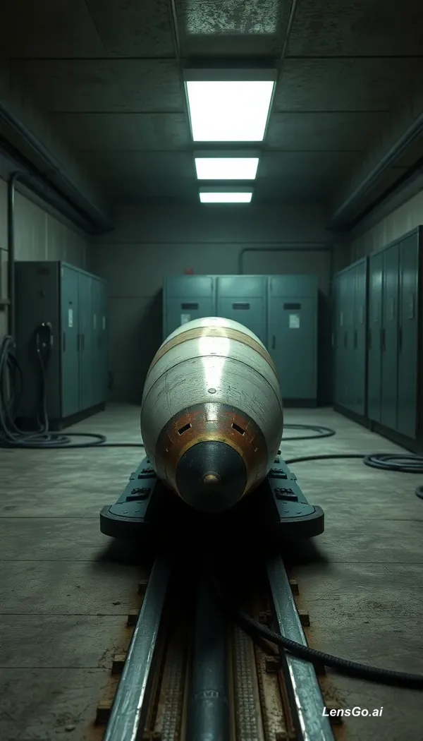 AI Image: AAA 3D game cutscene style, underground institutional test bay, scratched rocket sled on steel rail