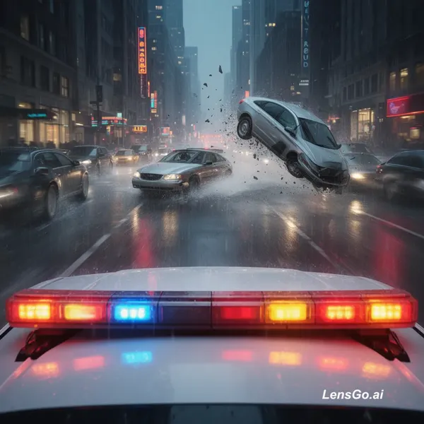 a wet city street during a rainstorm. The camera is mounted on the front hood of a police car, capturing the flashing red and orange emergency lights in the foreground. A silver sedan is seen speeding away through traffic, splashing through puddles. The police car accelerates, weaving through the wet streets to catch up. The chase reaches a climax when the silver sedan loses control, clips another vehicle, and flips over spectacularly in mid-air, spinning toward the camera amidst a spray of water and debris. The lighting is dramatic, with city neon and streetlights reflecting