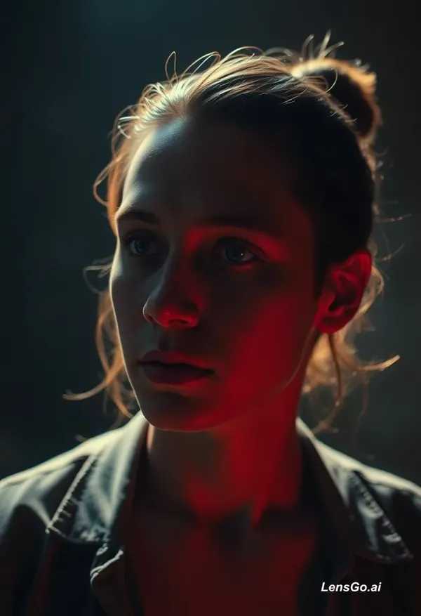 Cinematic portrait photography with dramatic lighting, shallow depth of field, film grain, moody atmosphere
