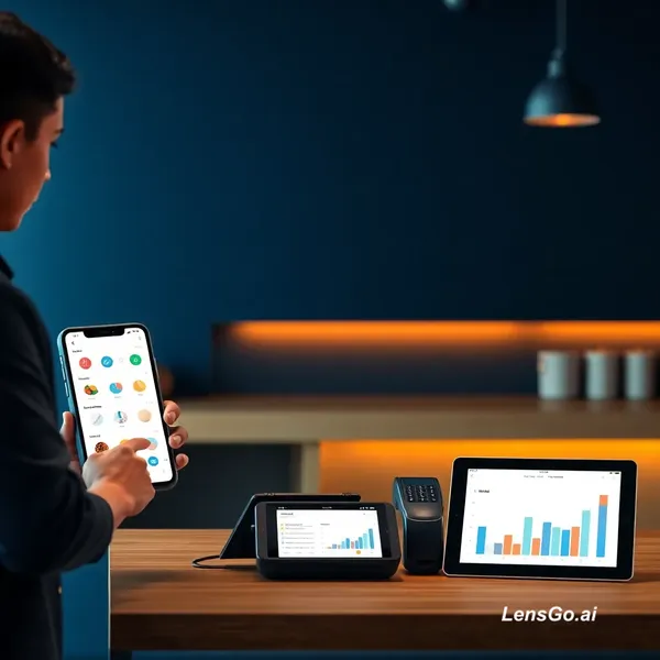 A clean, modern scene opens in a real business environment with dark blue tones and subtle orange highlights. A staff member is using a handheld POS device (Sunmi P3 Mix) to take a food order. They tap through menu options on the screen, and the order builds visually using simple shapes and icons (no text visible). The interaction feels fast, smooth, and natural, representing a FoodB-style ordering flow. The scene transitions seamlessly to the payment moment. A customer brings their card or phone close to a payment terminal. The Saturn and Ingenico card machines are shown in close-up as a contactless tap is completed. Immediately after, a second quick tap interaction is shown to represent a donation (TapDonate concept). The process feels instant and effortless. In the final moment, the camera pulls back slightly to show the full setup together on a counter: the POS device, card machines, and a tablet displaying simple analytics visuals like graphs and bars (no labels or text). The system feels fully connected, with order, payment, and donation all working together smoothly in real time. The entire flow is realistic, product-focused, and clean, with no abstract visuals and no text appearing anywhere on screen.