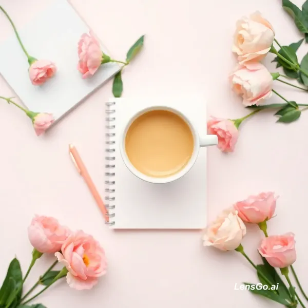 AI Image: Aesthetic flat lay composition for Instagram, pastel colors, coffee cup, notebook, flowers, minimali