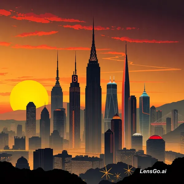 AI Image: Art deco poster of a futuristic city skyline at sunset