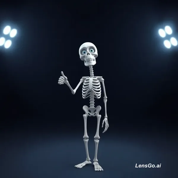AI Image: Create an imageA 3D animated skeleton standing in a dark background with spotlight, looking directly