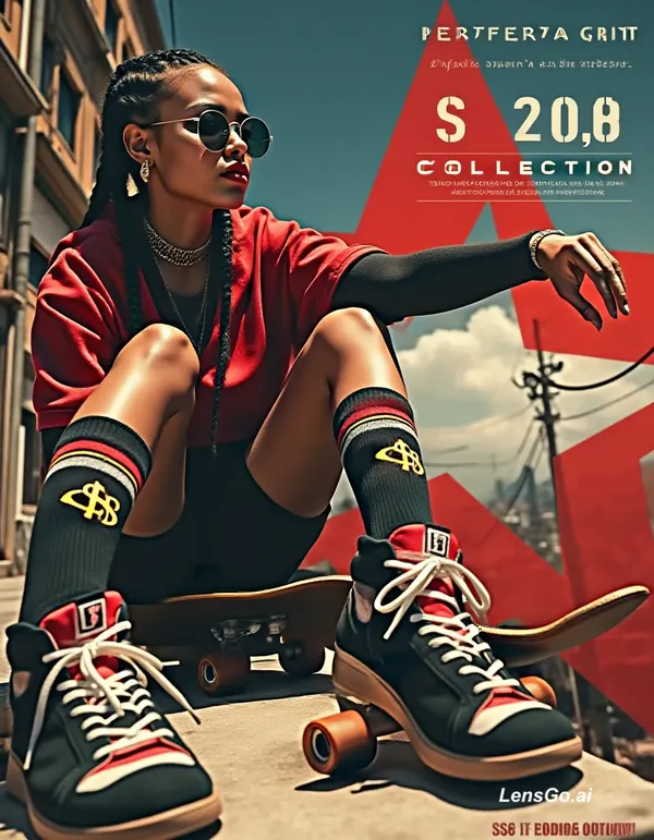 Urban fashion poster inspired by Brazilian periferia culture with editorial and streetwear aesthetics. A confident young woman sits on a skateboard in a strong low-angle perspective, legs forward, creating a bold and rebellious presence. She wears a red streetwear outfit, designer sneakers, and black knee-high socks with dollar symbols and rainbow stripes. Accessories include round sunglasses and minimal jewelry, with braided hair and a confident expression. Background shows a dense favela-style environment with layered buildings, wires, and subtle graffiti textures. The sky is cinematic with warm lighting and soft clouds. A large red abstract star behind the subject acts as a central graphic element. Overlay subtle map lines and technical graphics for depth. Typography: “PERIFERIA GRITA” in bold serif at top, “SINFONIA URBANA DA REBELDIA” large at bottom, and “SS26 COLLECTION” repeated with layered transparency, plus small phrases like “REBELDIA OUTLAW”. High contrast, rich reds, warm tones, slight film grain, sharp focus, ultra-detailed, 4K editorial finish.