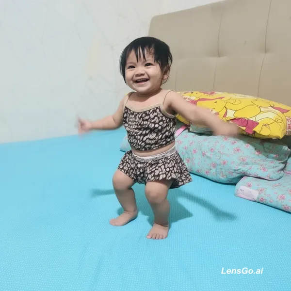 AI Image: Make a video from this photo of a baby who is sitting still into a baby who is standing and dancing