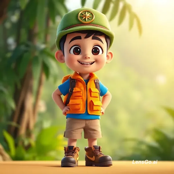 Prompt JI A full-body 3D animated character of a friendly 8-year-old Arab boy named Bader, based on the character in image_0.png. He has a cheerful, wide-eyed expression, wearing a distinct green explorer's hat with a gold compass emblem, an orange utility vest, and a blue t-shirt. His shorts are light brown and he wears durable hiking boots. The style must match the vibrant, high-quality Pixar-like animation from image_O.png, set against a soft, bright jungle background, looking adventurous. Clean lines, studio lighting, highly saturated colors
