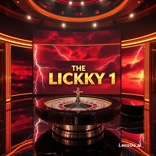 Ultra realistic high-end live casino studio set with an elegant roulette table as the central focus. Luxurious environment with gold and silver accents, polished chrome, glossy black marble, highly reflective surfaces and cinematic composition. The studio is brighter overall with enhanced ambient lighting and strong visibility across the entire scene. Dramatic yet well-lit atmosphere with volumetric lighting, depth of field and ultra-detailed reflections. Background shows a storm-inspired casino show aesthetic: intense sunset sky with deep red and crimson tones, clearly visible storm clouds, glowing atmospheric haze, and dynamic lightning bolts and energy streaks illuminating the scene. Clouds must remain clearly defined and not obscured. Behind the roulette table, a massive cinematic LED-style sign displays "THE LUCKY 1" in bold luxury typography with gold and red metallic styling, surrounded by subtle electric thunder energy effects. The scene blends premium casino elegance with high-energy broadcast show visuals, combining warm luxury gold tones with dramatic electric storm energy. Futuristic live game show stage, ultra detailed, 8K realism, high contrast but balanced exposure, sharp focus, cinematic lighting, premium studio broadcast look.