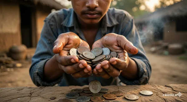 AI Image: "A poor teenage boy sits outside a small mud house in an old village at sunset, counting a few coins