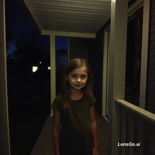 AI Image: girl, at night, on a porch of a house, phone quality, bad resolution,