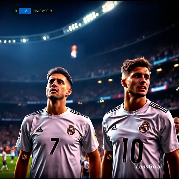 Cinematic TV broadcast, Santiago Bernabeu stadium at night, Real Madrid football player number 7 and player number 10 looking exhausted and sweaty, scoreboard showing Real Madrid 0 - 2 Barcelona, halftime, disappointed fans in background, 4K, ultra realistic, dramatic lighting