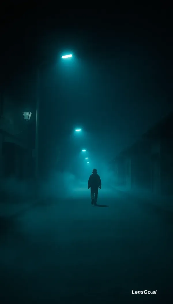 cinematic dark cartoon horror scene. A lone character walking through a foggy abandoned street at night. High-contrast lighting, deep shadows, dim streetlights flickering. Thick fog drifting across the ground, empty surroundings, eerie silence, slow camera tracking forward, moody blue and green tones, unsettling atmosphere."