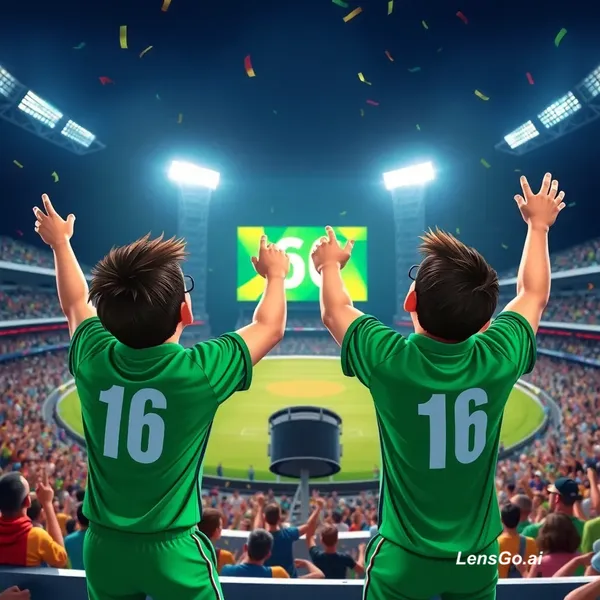 AI Image: 3D Pixar cartoon style, night cricket stadium, bright flood lights, two fans in green jerseys celebr