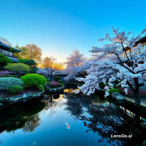 AI Image: A serene Japanese garden at golden hour, koi pond reflecting cherry blossoms