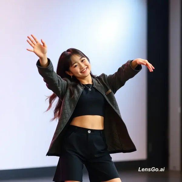 AI Image: girl doing a cute k-pop dance, energetic but soft movements, k-pop choreography style, smiling, movi