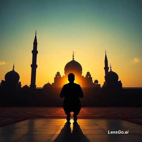 AI Image: Prompt: Final संदेश scene: silhouette of a person praying (salah), mosque in background, sunset sky,