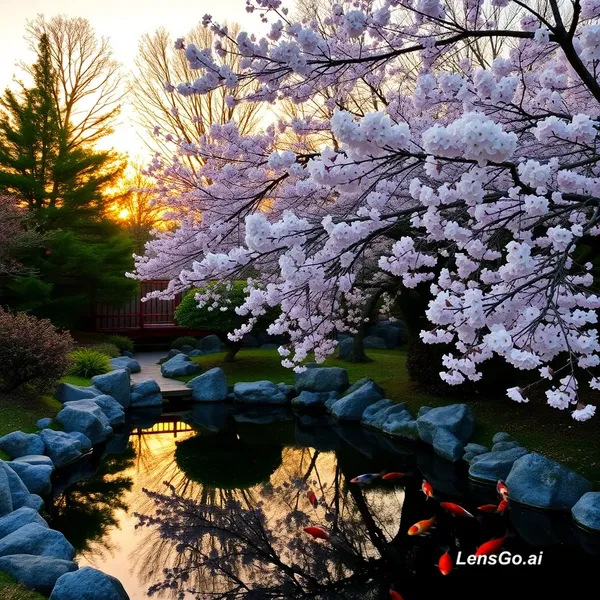 AI Image: A serene Japanese garden at golden hour, koi pond reflecting cherry blossoms