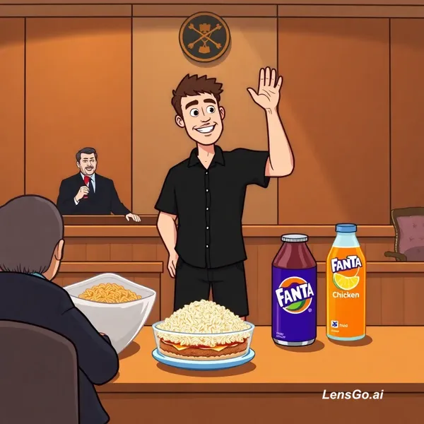 Use the uploaded image as reference to generate a image of me wearing a black shirt, dark shorts standing in a courtroom while a judge shouts order, the man raising his hand like he wants to order food, rice chicken and Fanta appearing on the table, comedic scene, cartoon style