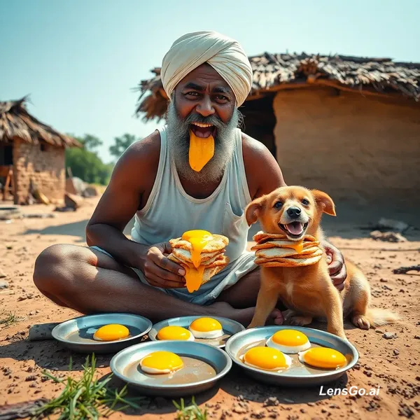 A hyper-realistic, wide-angle cinematic shot of a burly, middle-aged Indian man with a salt-and-pepper beard wearing a white turban and a dusty white tank top, sitting cross-legged on the ground outside a rustic mud hut in a rural village. He is enthusiastically devouring a massive stack of fried eggs with runny yolks, with yolk dripping down his chin. Next to him sits a scruffy, happy golden-brown dog looking at the camera with its tongue out. In front of them are several metal plates with individual sunny-side-up eggs. The ground is dry earth with sparse green weeds. The background features a thatched-roof hut and distant trees under a bright, hazy blue sky. High contrast, vivid textures, 8k resolution, documentary photography style.