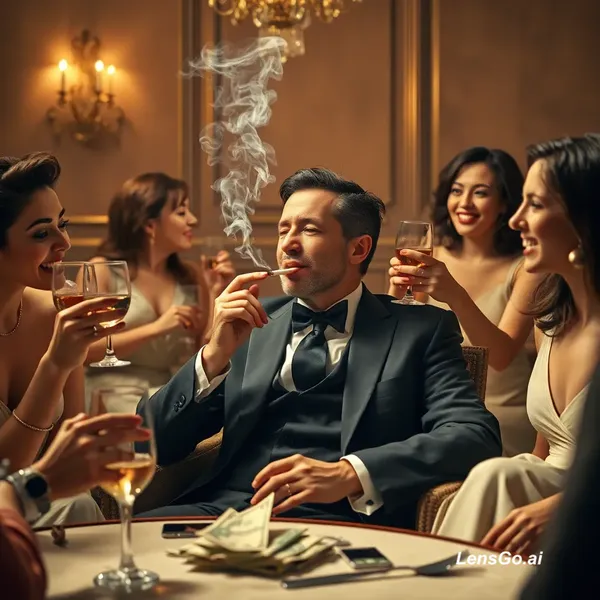 same people, realistic scene, man sitting in chair holding cigarette, puts cigarette in his mouth, slowly inhales and exhales smoke, smoke rising naturally, three women around him laughing and raising their glasses, elegant party atmosphere, then the man throws money on the table toward the women, subtle natural movement, no face change, realistic lighting