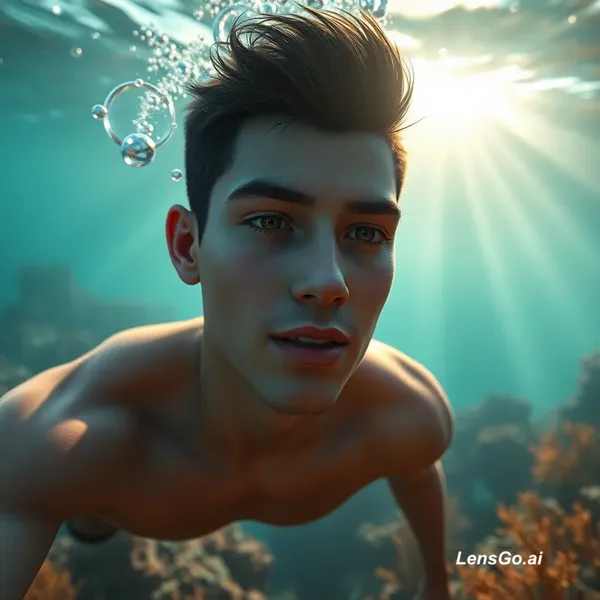 cinematic 3D CGI animated scene, stylized realistic 3D human character, instagram reel style 3D animation, young man underwater breathing normally, detailed coral reef environment, dramatic underwater lighting, sun rays from water surface, bubbles rising slowly, realistic water particles, depth of field, octane render, unreal engine cinematic lighting, high detail, vertical frame, social media storytelling style Negative prompt (नीचे डालना): real photo, photorealistic, cartoon, anime, illustration