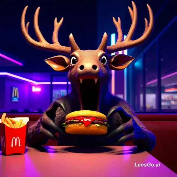 AI Image: A detailed 3D render of the specific bipedal deer monster from the reference image, sitting at a McD