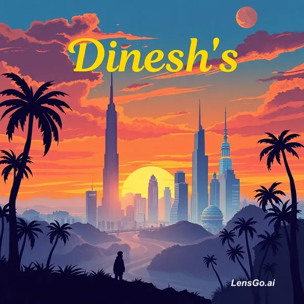 "Story: “Dinesh’s Story” In a small village named Dugoli, there lived a little boy named Dinesh. When Dinesh was about 2 years old, his parents left him at his grandparents’ house. His grandmother lived in a village called Tumnar. There, Dinesh started living and growing up.Art deco poster of a futuristic city skyline at sunset