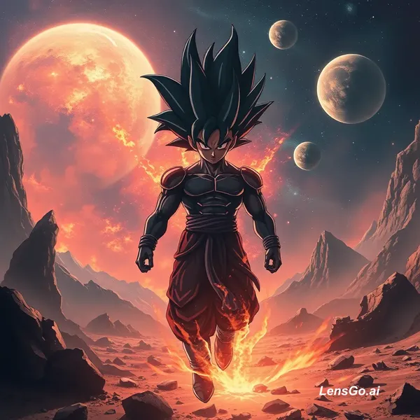 AI Image: The universe holds its breath… A fallen world… broken mountains… burning skies… Moro walks slowly th