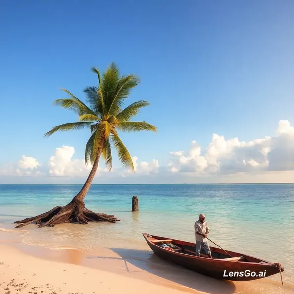 AI Image: A man is fishing on an island with a big coconet tree