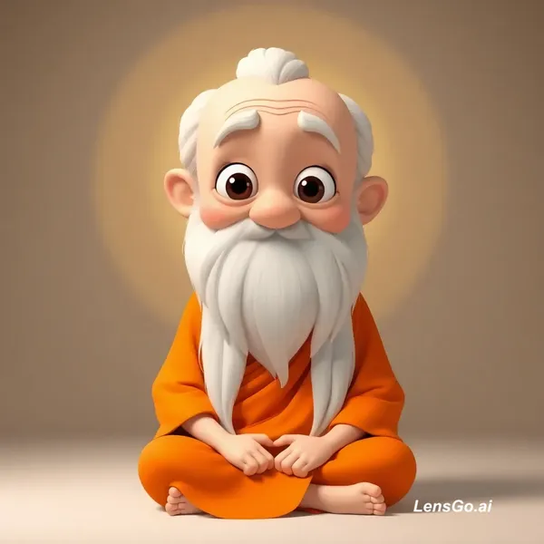 AI Image: "cute old yogi, long white beard, big kind eyes, orange robes, sitting cross-legged, peaceful smile,