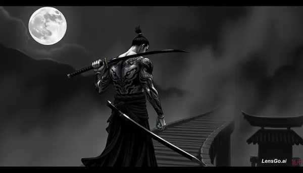AI Image: a drawing in black and grey an imposing, heavily tattooed ronin stands on a misty bridge at night, m