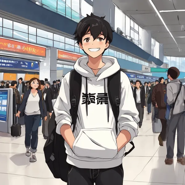 Medium shot, anime cinematic style.(inside airport near immigration desk) boy wearing black denim and white hoodie Boy nods (age of 22)politely and smiles. Eyes show excitement and hope.