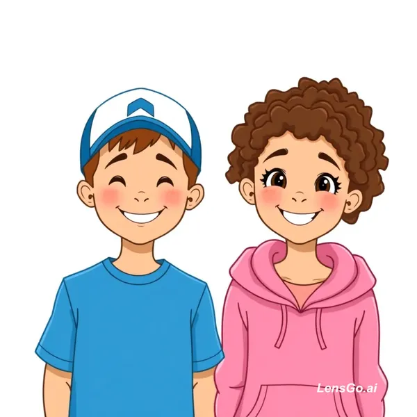 A cheerful, diverse pair of 8-year-old best friends, a girl with curly brown hair wearing a pink hoodie and a boy with a baseball cap in a blue shirt. Digital illustration style, friendly expressions, full body shot, plain background."