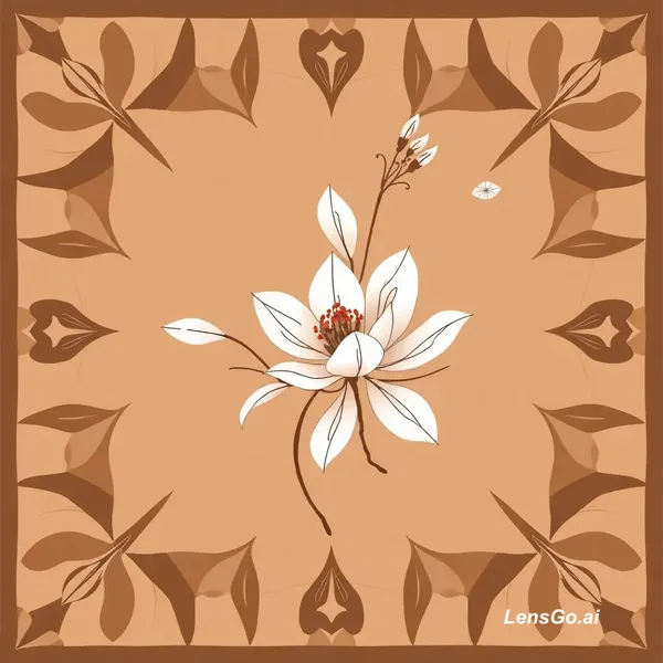 Luxury silk scarves design, square textile pattern, symmetrical composition, dynamic motion lines, flower petals in motion, botanical element, delicate wildflower, elegant, poetic, quiet luxury aesthetic, earth tones, muted greed and off-white pallete, fine line illustration, silk texture