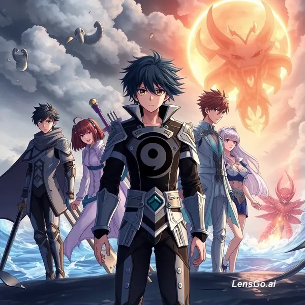 Create an anime action scene set in the futuristic year 4321 in a floating ocean city. The world is dark fantasy mixed with advanced technology. The sky has storm clouds and glowing ocean rifts where cursed demons emerge. Main character Ren Kaizoku, a 16-year-old boy with messy black hair, glowing silver-gray eyes, and a black swirling mark on his chest, wears a black and silver Curse Slayer uniform with armor plates. He uses Void Heart Style, allowing him to sense the moving hearts inside demons. His team stands beside him: Mira Akihara – 15, short black hair, gentle brown eyes, light blue and white uniform, glowing spirit energy around her hands. She uses Spirit Heart Style to heal and stabilize the team. Kaito Hayashi – 17, tall and muscular with spiky brown hair and amber eyes, heavy armor and a large sword. He uses Steel Heart Style with powerful precision strikes. Sora Minami – 16, slim with silver hair tied in a short ponytail and blue eyes, carrying a bow. She uses Wind Heart Style for fast aerial attacks. Ryuuzen Tora – 18, large and muscular with flame tattoos and battle scars, wearing flame armor. He uses Flame Heart Style with explosive fire attacks. A giant Leviathan-class cursed demon rises from the ocean near the docks. The demon is massive with black scales, glowing red veins, and several glowing hearts moving inside its body. Action choreography The battle begins. Sora jumps to a rooftop and fires wind arrows, creating a cutting wind corridor. Ryuu
