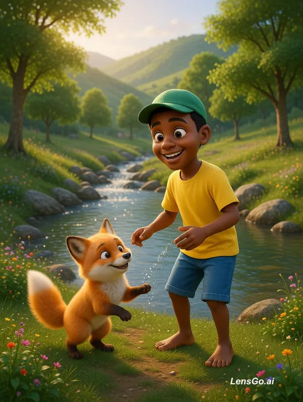 A high-quality 3D cartoon style illustration of a young Somali boy named Hirsi playing with his fox best friend near a clear flowing river. Hirsi has warm brown skin, big expressive eyes, short black hair, wearing a green cap, yellow t-shirt and blue shorts, barefoot and smiling happily. The fox is small, fluffy, bright orange with white chest and tail tip, playful and friendly. They are in a beautiful green landscape with trees, flowers, rocks, and soft sunlight. Background includes rolling hills.