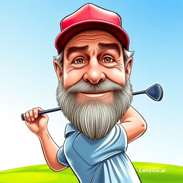 Create a detailed caricature of this man, keeping his face recognizable with salt-and-pepper beard, expressive eyes, and red baseball cap. Exaggerate facial features slightly in a fun, friendly caricature style. Attach his head to a golfer's body mid-swing, with a dynamic pose and golf club in motion. Show a bright green golf course with blue sky. Use vibrant colors, clean outlines, and a polished digital caricature style. Make the head slightly larger than the body for a humorous effect.