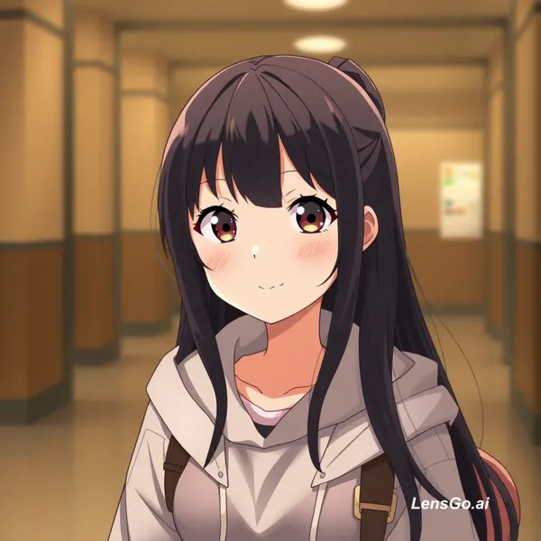 AI Image: anime style young girl, long black hair, casual hoodie, student, soft lighting, cinematic, consisten