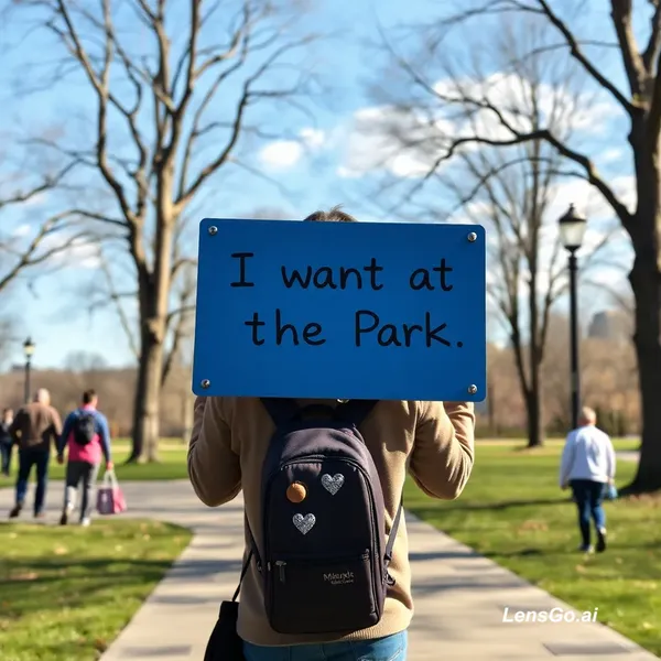 AI Image: I want at the park walking with placard written it's TRIVIA TIME