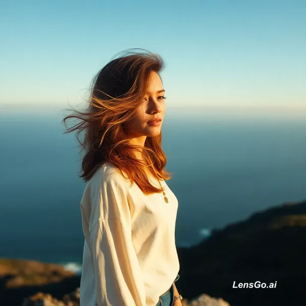 AI Image: Cinematic shot of a woman standing on a mountain, wind blowing her hair, ocean in background, slow c